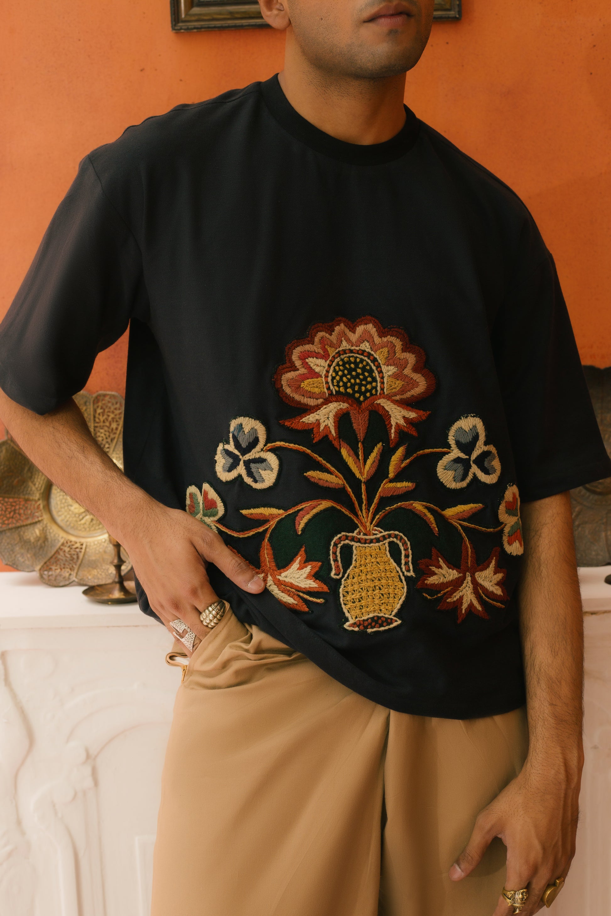 This tee shirt is hand-embroidered by our skilled artisans, showcasing their dedication to traditional craftsmanship. Each stitch reflects hours of careful work, bringing rich texture and timeless detail to life.