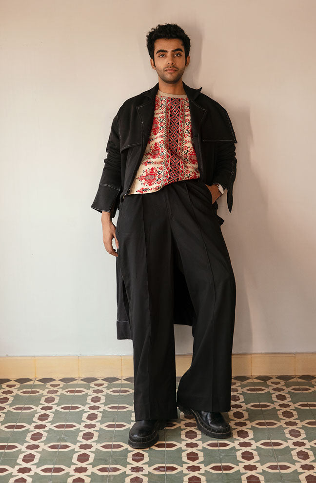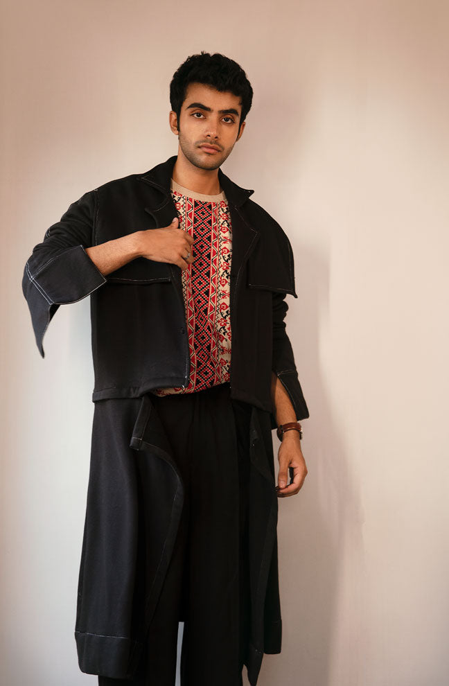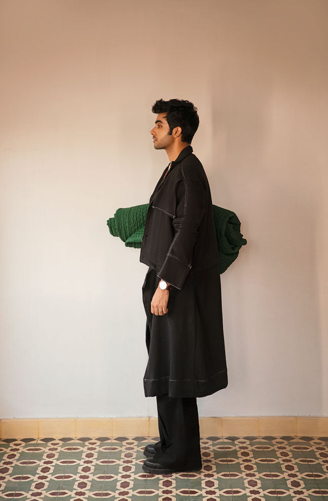 This oversized rebellious coat is cut from cotton jersey in an exaggerated silhouette with white cotton thread detail all over it. It will add an air of refinement to a wide range of