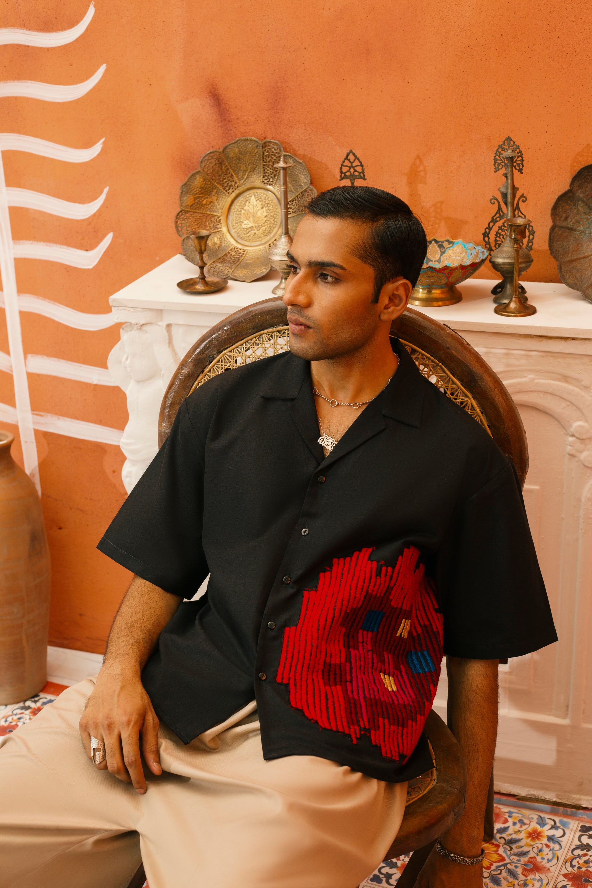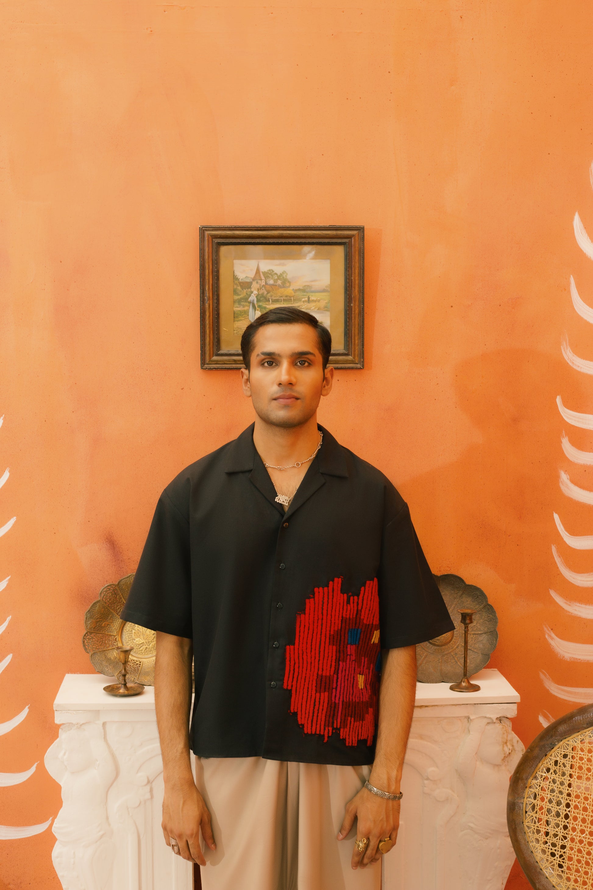 This shirt features woolen hand-embroidered abstract floral and is crafted from eco-friendly materials, it merges artistry and sustainability.