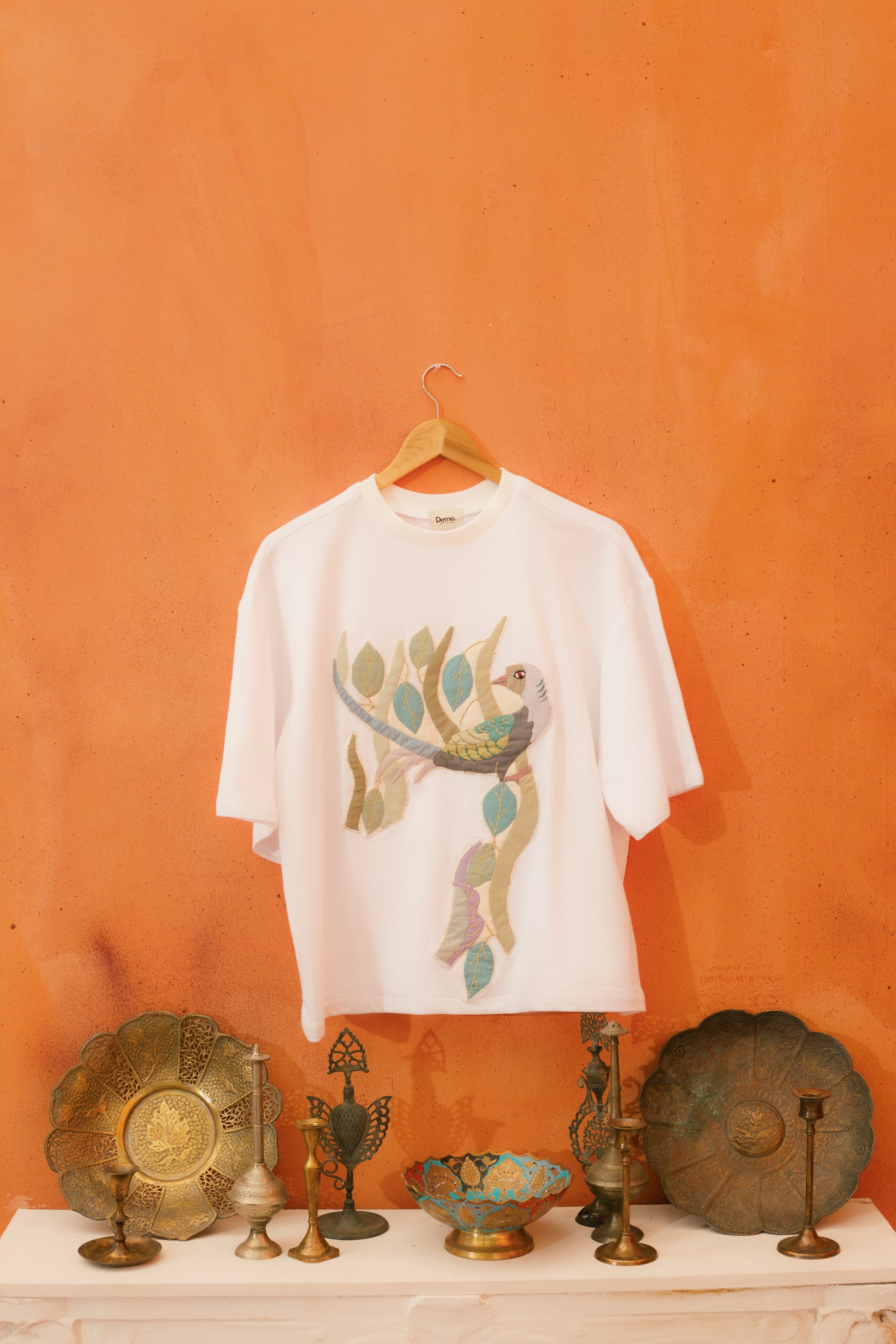 Delicate patchwork and hand embroidery bring a bird to life on a clean white tee, nature’s poetry in thread.