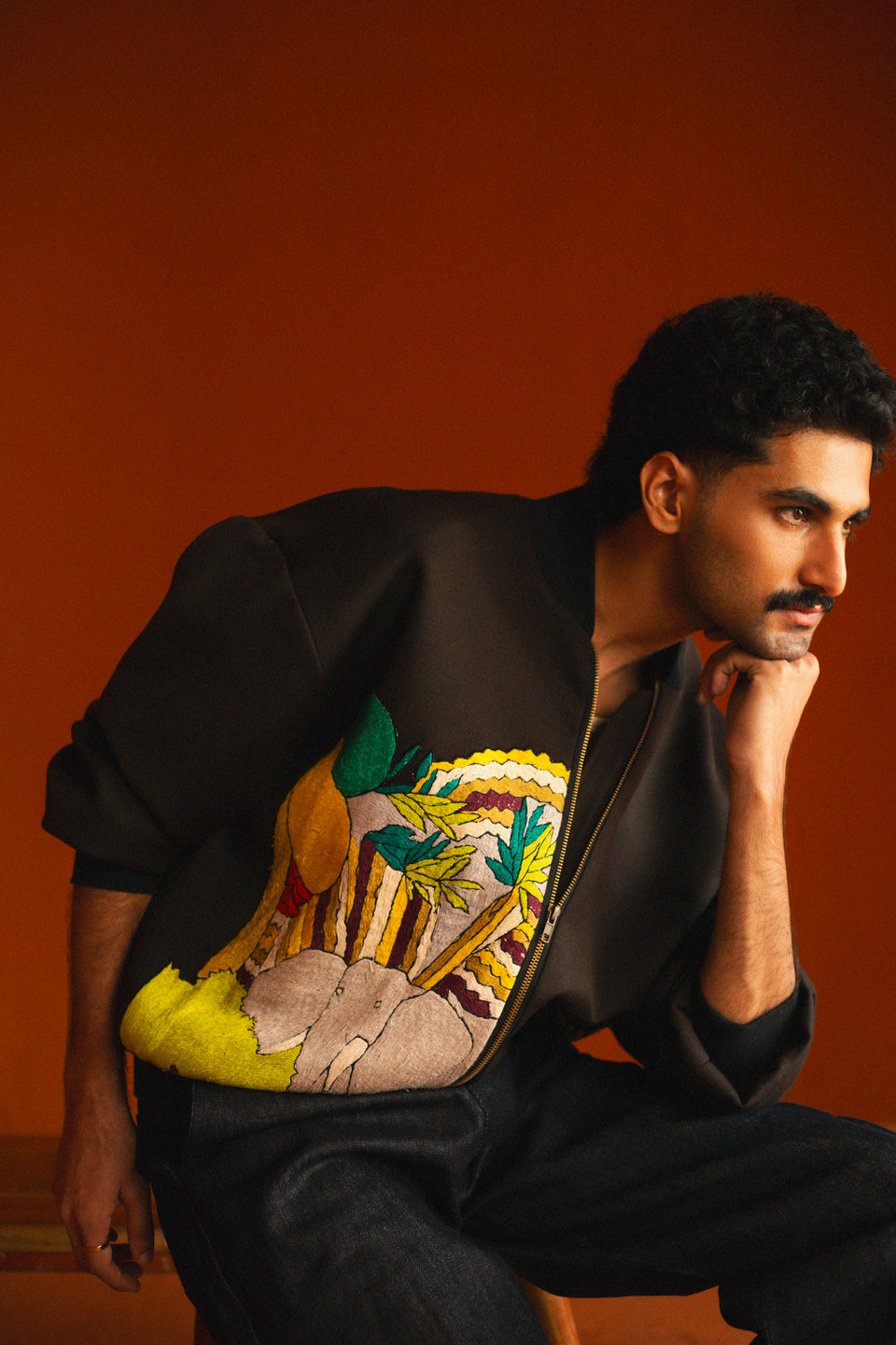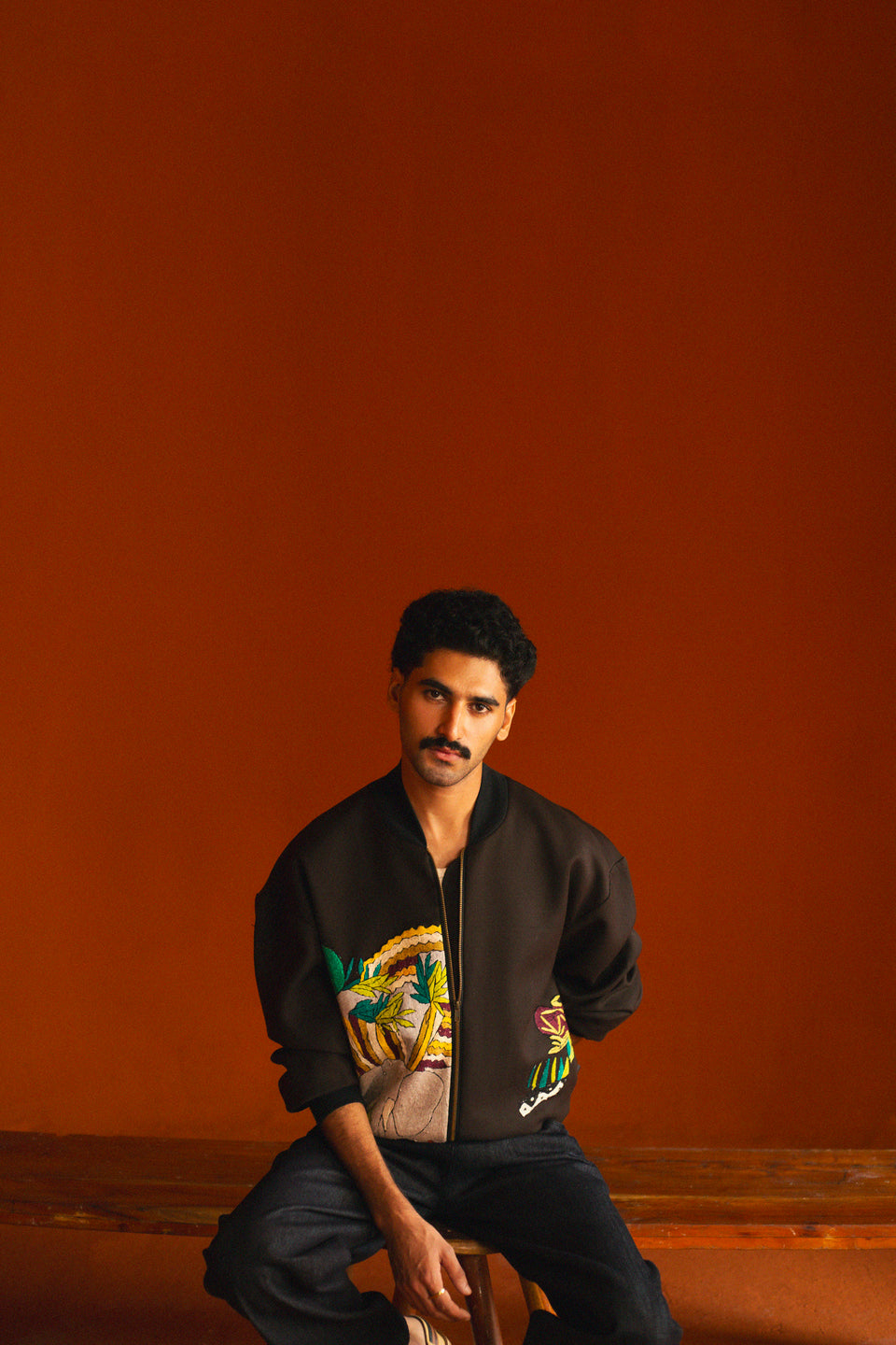 Art in motion, bold hand embroidery brings nature to life on this dark brown canvas.