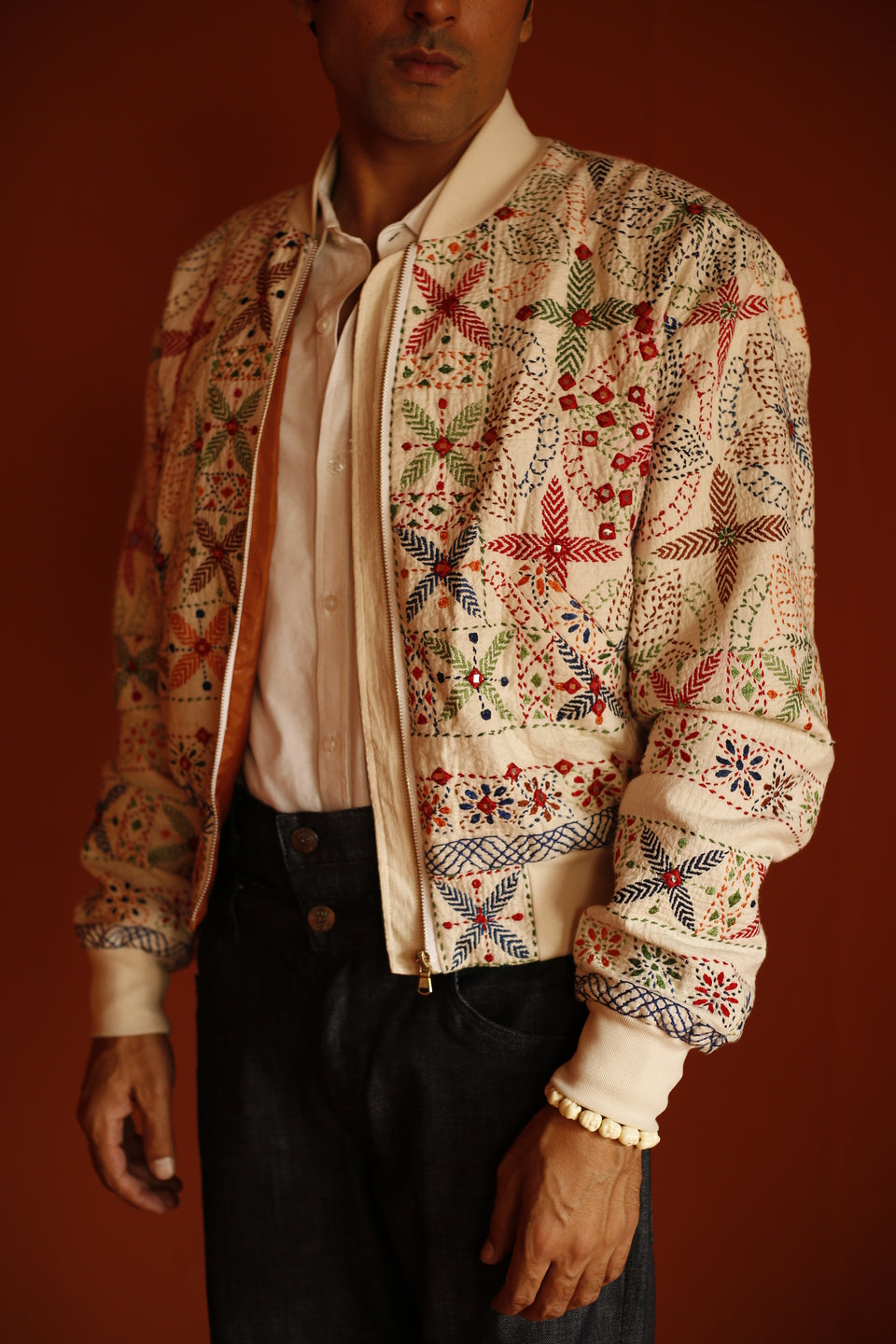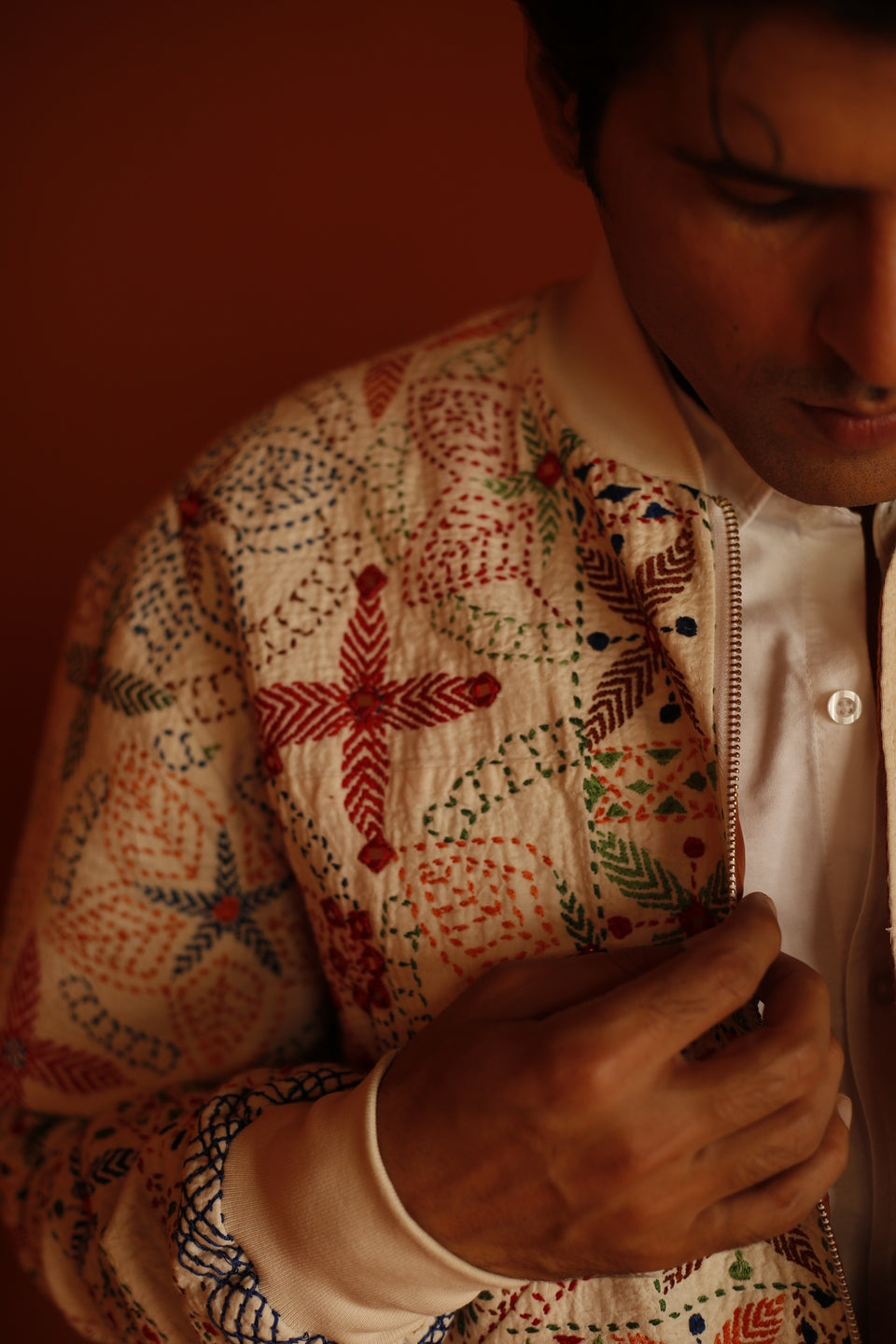 A clean white base brought to life with vivid threadwork, every stitch a mark of artistry.