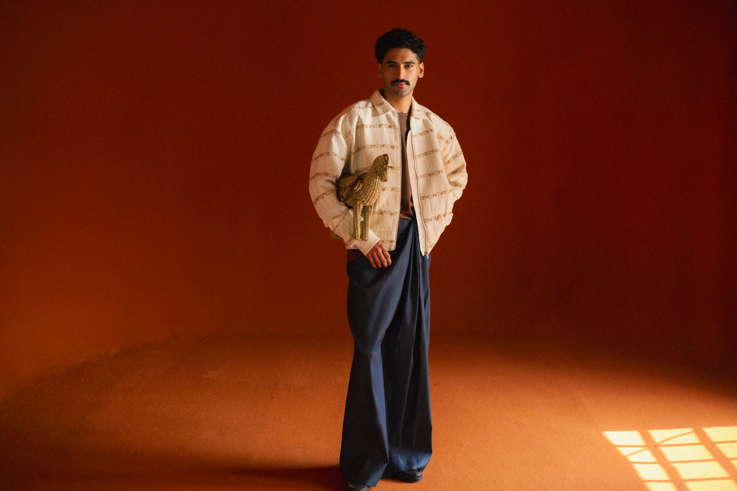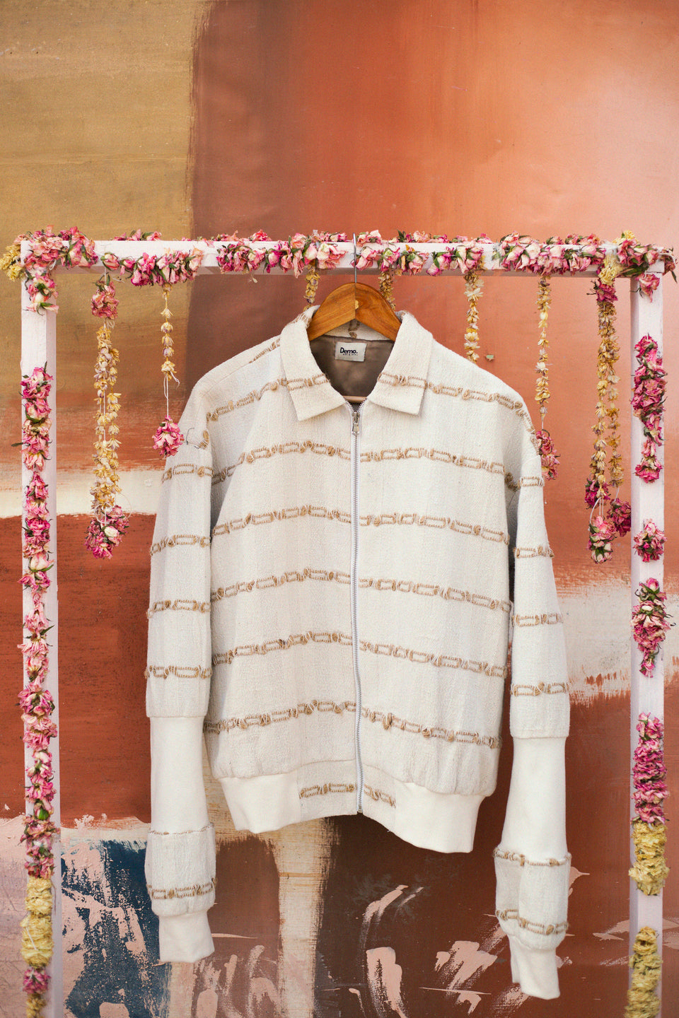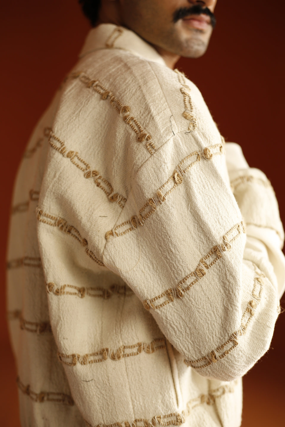 Light, textured, and rooted in craft, these jute weave lines adds depth and dimension to the jacket.