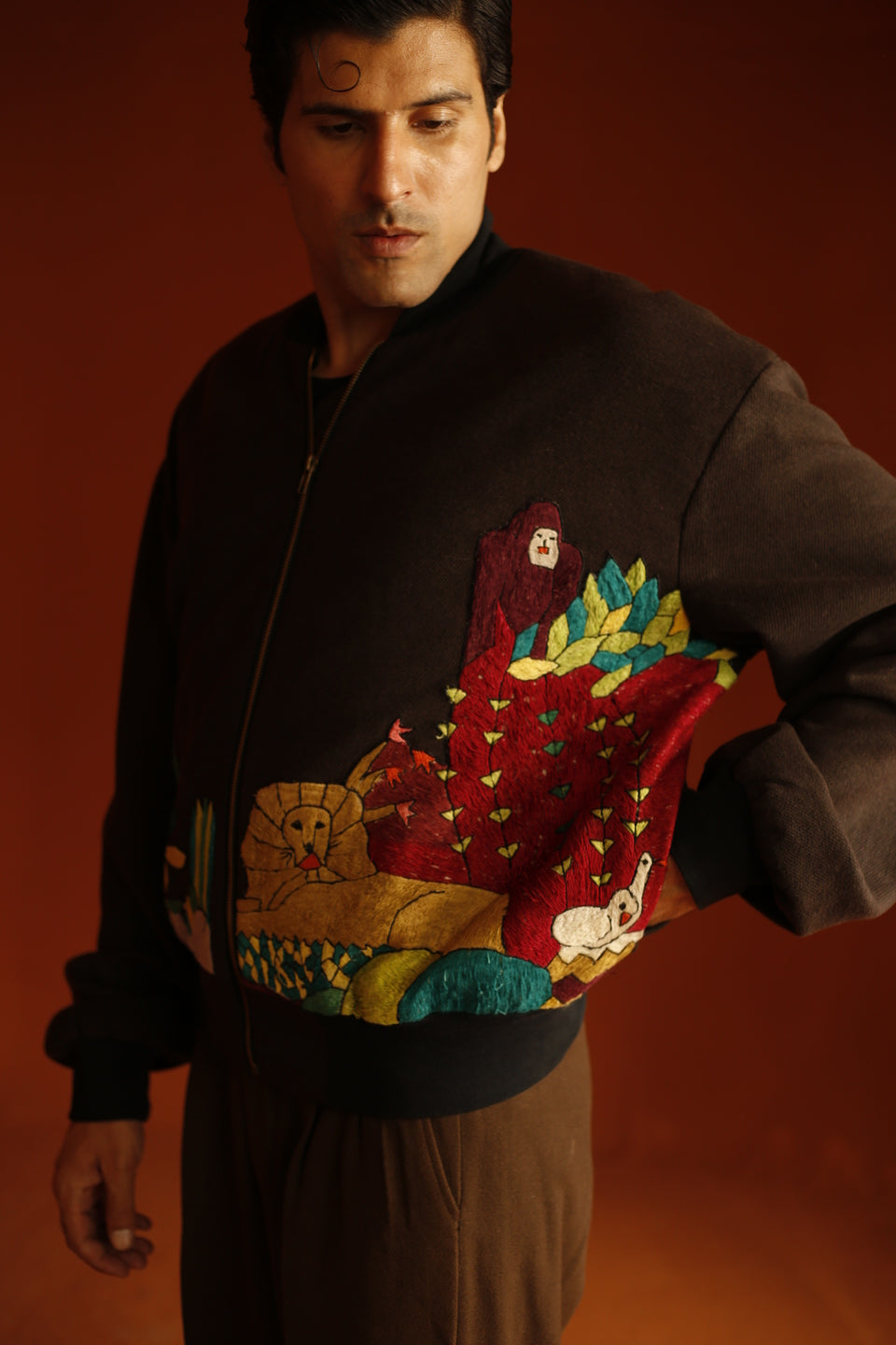 Each stitch weaves a story, textured leaves, animals, and abstract forms come together in a striking expression of art.