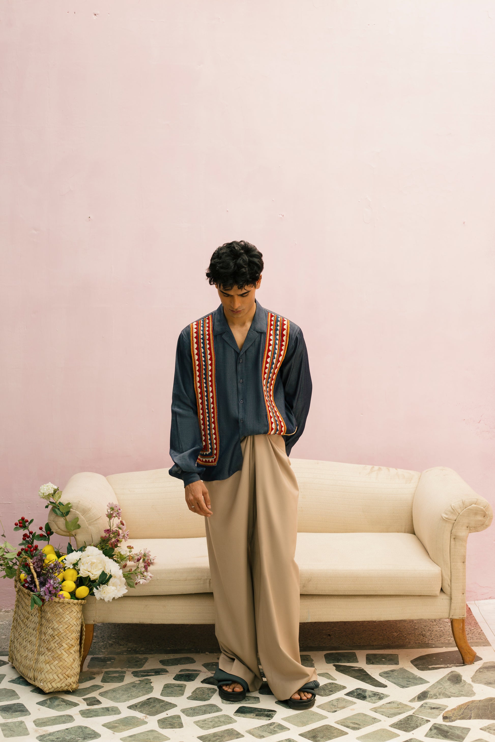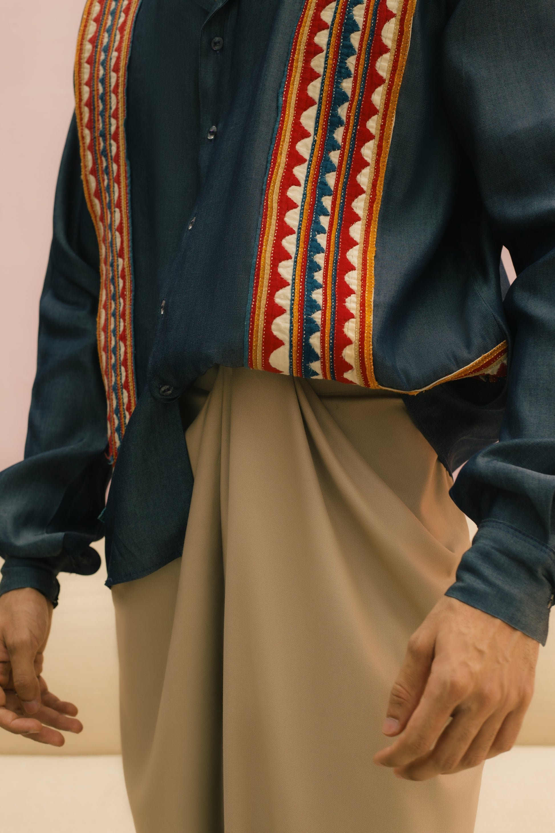 A canvas of blue adorned with South Asian Ralli patchwork and hand embroidery, tradition stitched into every thread.