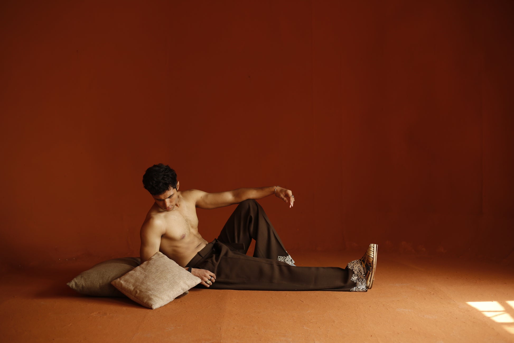 A canvas of craftsmanship, brown pants adorned with white embroidery, sustainably tailored.