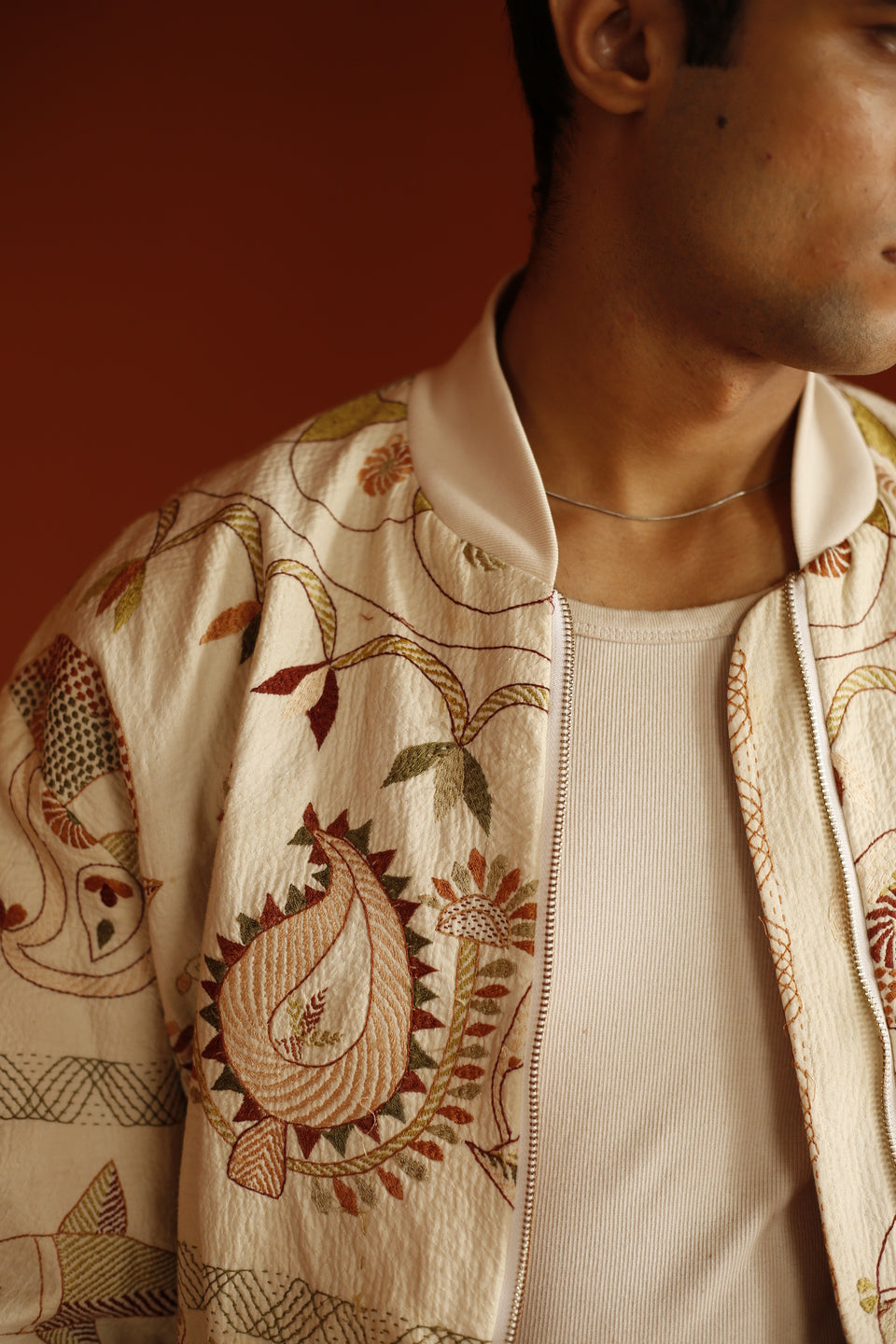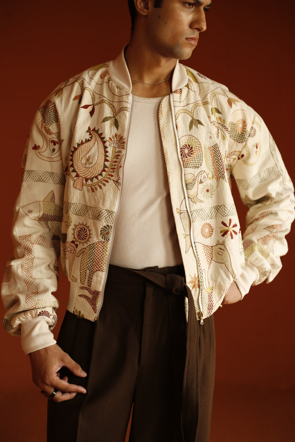 This embroidered jacket features detailed motifs, elephants, birds, florals brought to life with earthy tones on a creamy backdrop.
