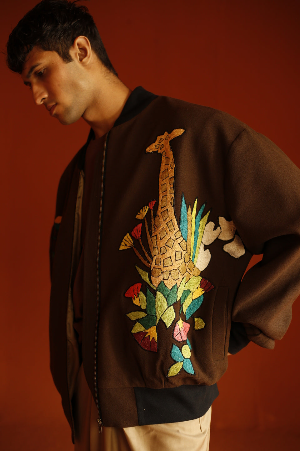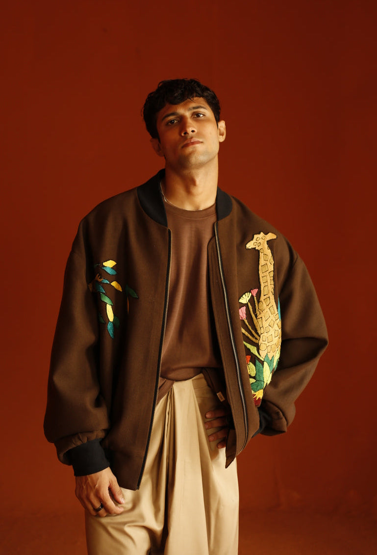 A canvas of craft and color, this rich brown jacket features bold, hand embroidered artistry that captures nature in motion.