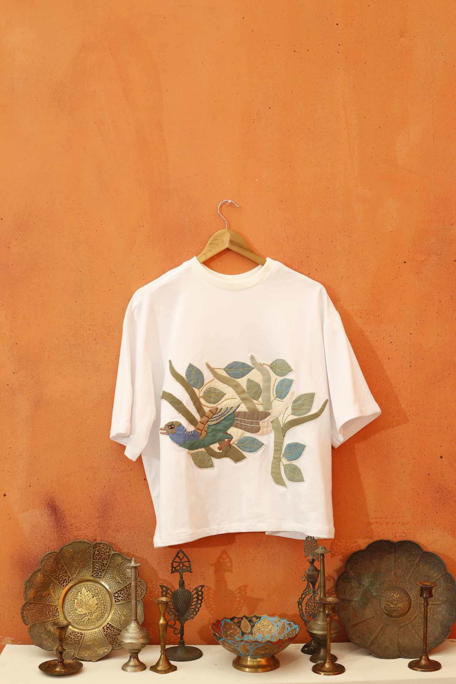 Delicate patchwork and hand embroidery bring a bird to life on a clean white tee, nature’s poetry in thread.
