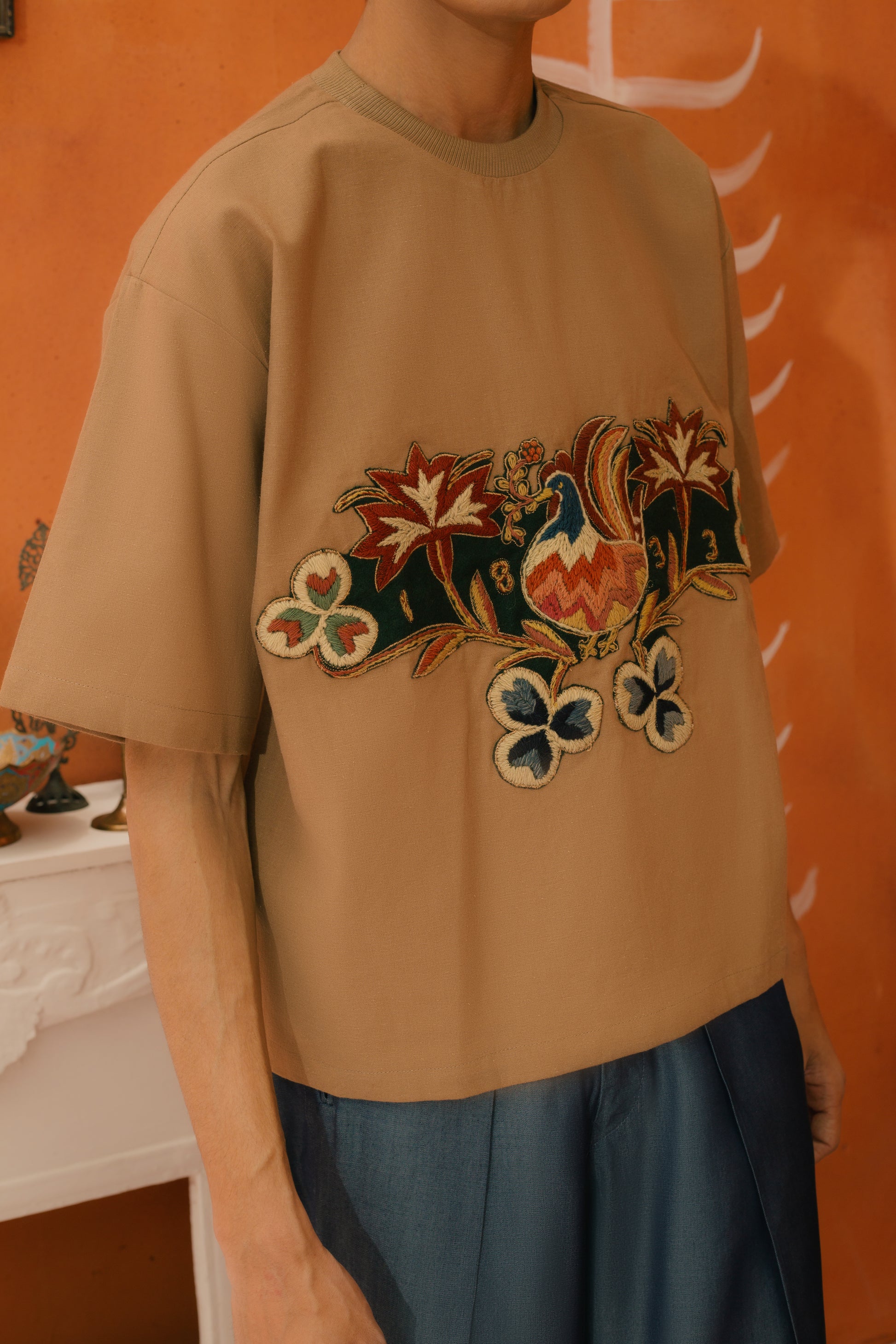 This tee shirt is hand-embroidered by our skilled artisans, showcasing their dedication to traditional craftsmanship. Each stitch reflects hours of careful work, bringing rich texture and timeless detail to life.