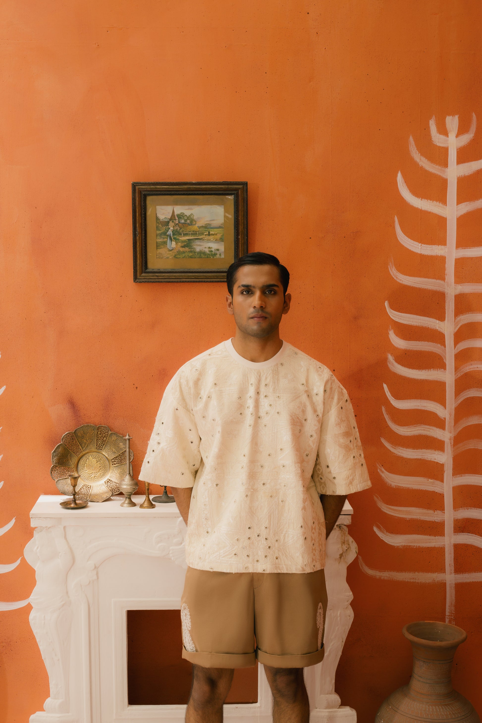 An impeccable blend of resham embroidery and sheesha work on a white canvas. This Product promotes artisanal skill and adhere to ethical principles.